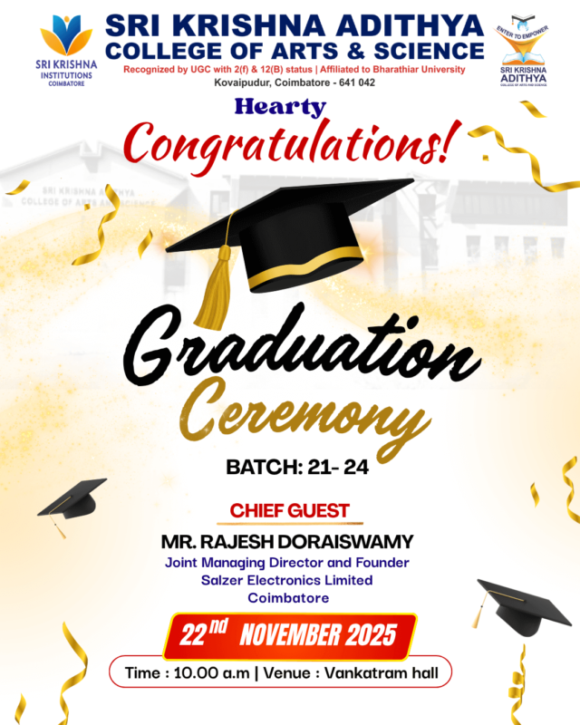Sri Krishna Adithya College of Arts & Science was established during May 2015 with the motto “Grooming Leaders for Twenty-first Century”. It is affiliated to Bharathiar University, Coimbatore. The campus is stretched under the foothills of Western Ghats providing an ambience of natural nourishment for education. The Institution aims to provide quality education to meet the standards of global requirements. The cutting edge technology with innovative academic programmes tailors the students gradually into the role of smart citizen in a globalized environment who can shoulder greater responsibilities.