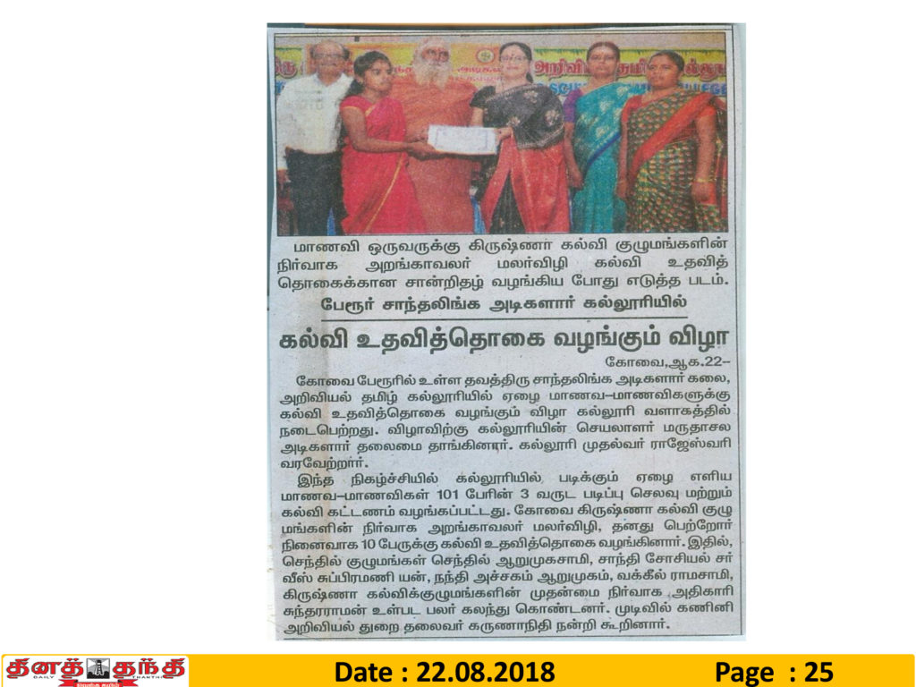 As a trustee, she is associated with Avinashilingam Trust – Institute of Higher Education and Home Science for Women, Uyir – A Social Service Organization for Road safety, Santhalinga Adigalar Hospital Trust, and Global Kongu Foundation – For Youth Empowerment.